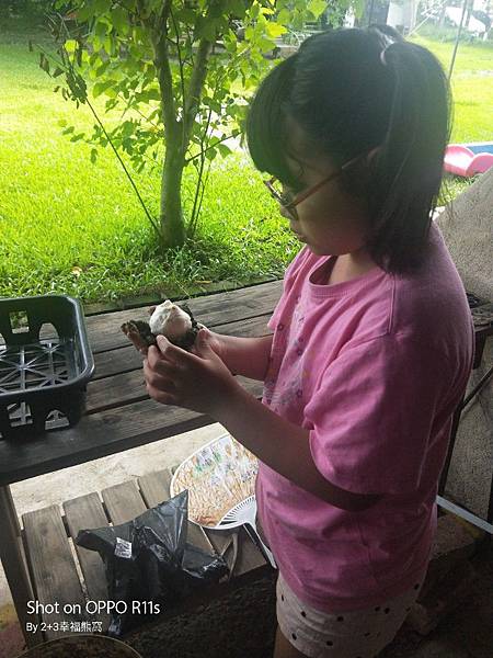 真妹妹撿了根樹枝在蛋土上畫了個笑臉。
