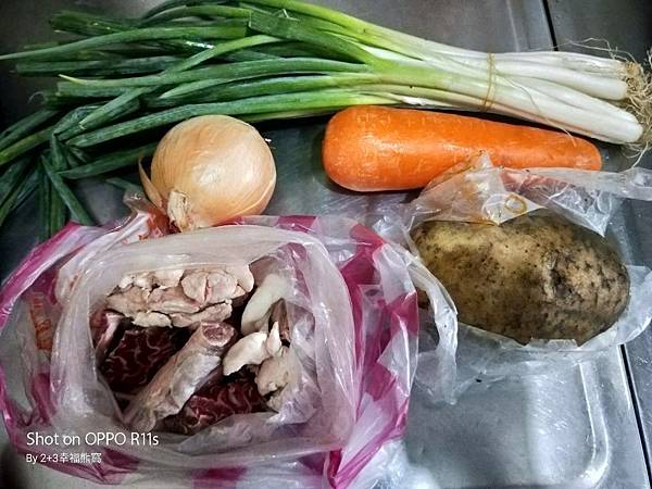 準備材料有:洋蔥、紅蘿蔔、馬鈴薯、一大把蔥和牛肉。還有一顆未入鏡的牛番茄。